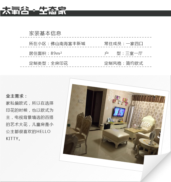 但因為只看過太氧谷硅藻泥一家,也是第一次了解硅藻泥,正常人的心態(tài)都會想多對比一番。張先生和太太大概下午2點多從太氧谷店走出去,轉(zhuǎn)了一圈周圍的門店,看過硅藻泥大大小小的數(shù)個品牌,最后在5點左右又折返回來太氧谷,當(dāng)即就下定簽了合同,挑好花型、算好材料,當(dāng)天就敲定了施工日期,過程順暢、一氣呵成! 為什么最終還是選擇了太氧谷硅藻泥?張先生在陳述理由時流露出商人在對比權(quán)衡時特有的智慧與閱歷,他說價格上太氧谷并不是最有優(yōu)勢的,但是綜合花型、品質(zhì)、和服務(wù),太氧谷的好就立馬凸顯出來了!花型獨特,品質(zhì)更細膩柔滑、服務(wù)上更是無可挑剔,很多小細節(jié)都體現(xiàn)了用心、細致,并且真正在為顧客考慮和著想。另外他強調(diào),了解到硅藻泥是需要手工施工上墻的產(chǎn)品,所以產(chǎn)品品質(zhì)、團隊的嚴謹用心還有專業(yè)態(tài)度是他最為看重的,而這一點,只有太氧谷是經(jīng)過他的觀察和考核滿分通過的!張先生說他向來對自己的判斷非常自信,把自己的家交給太氧谷這個專業(yè)團隊,他很放心! 客戶的放心就是最大的肯定,最后做出來的成品,也不負張先生所望,甚至超出他的期待。歐式的印花搭配精挑細選的歐式家具,整體和諧,自然與優(yōu)雅融為一體,兒童房的hello Kitty,小寶貝更是喜歡得不得了!
