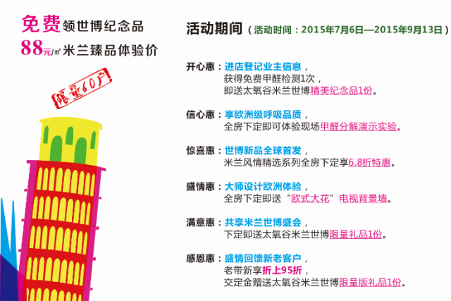 太氧谷硅藻泥攜手與您“向室內(nèi)污染宣戰(zhàn)”,盛情感恩鉅惠,不僅有史上最大幅度讓利的勁爆鉅惠:88元/㎡即可享受米蘭臻品體驗價,米蘭風情精選系列特價鉅惠,讓您凈省近萬元!為契合米蘭世博主題,太氧谷更是傾情推出米蘭世博限量版紀念品,獨此一家,數(shù)量有限,先到先得!