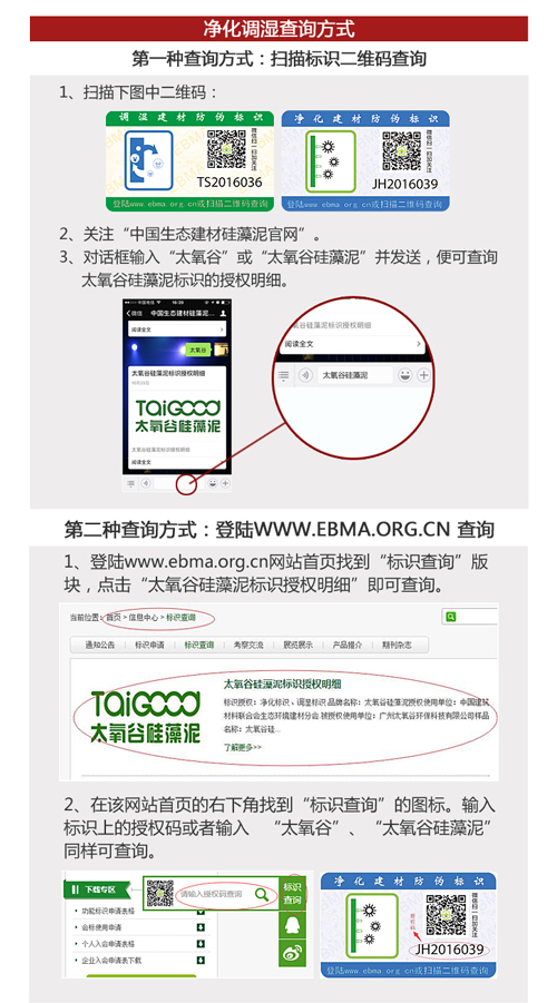 中國建材聯(lián)合會生態(tài)環(huán)境建材分會是目前硅藻泥行業(yè)最權威的組織。為使廣大消費者更好的辨別市場上的硅藻泥正規(guī)產品,規(guī)范硅藻泥市場,分會推出了“調濕”“凈化”兩個標識,并已在國家商標總局注冊通過。凡經由檢測、且符合國家JC/T 2177-2013【硅藻泥裝飾壁材】行業(yè)標準的硅藻泥產品方能使用“調濕”“凈化”兩個標識。消費者購買太氧谷硅藻泥產品,同樣也可認準官方授權防偽的"調濕"、"凈化"標識,只買讓人放心的高端品質硅藻泥!