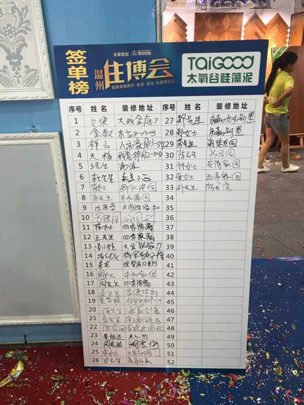 太氧谷團隊全力備戰、傾巢出動,且得到太氧谷營銷副總張小平先生、總公司區域經理及浙江其他太氧谷門店老總等專程趕來的大力支援,現場群策群力、分工協作,既有負責掌控全場搞氛圍的,也有負責兼職吸引客流的,還有負責促單成交的,所有人職責分明分工明確,最終,憑借空前的價格優惠、過硬的產品質量以及優質的服務,最重要的是在團隊共同努力之下,消費者下定太氧谷的全房訂單紛至沓來,據不完全統計,太氧谷在當天簽下了33個全房訂單,在墻面產品品類中排行第一,而同類競爭的某品牌僅不到10單,將對手遠遠跑在后頭!此次溫州團隊協同作戰輕輕松松打了一場空前漂亮的勝仗!