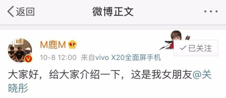 國民老公鹿晗在微博艾特關曉彤說,大家好,給大家介紹一下,這是我的女朋友。關曉彤則羞澀地回復,哇咔咔。