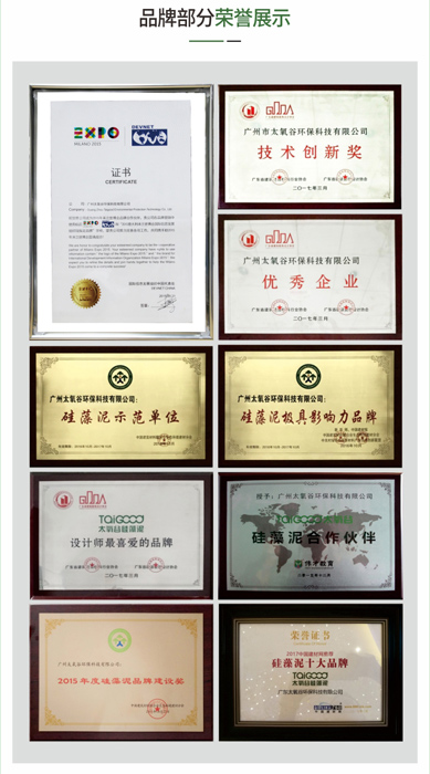 同時,為了讓消費者對我們的產品更有信心更受保障,太氧谷以品質立根基,首批入圍國家質量認證體系,同時也是行業內權威機構生態環境建材分會的硅藻泥示范單位、行業硅藻泥壁材起草主編單位,更是米蘭世博會指定硅藻泥品牌、建材網連續幾年十大推薦硅藻泥品牌、數個硅藻泥網十大品牌的榮譽獲得者。這么多含金量十足的榮譽加冕,讓我們的產品品質更有底氣,為客戶的權益保駕護航,將“專業除醛”進行到底!