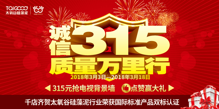 為了感謝尊敬的客戶對我們一路以來的支持,太氧谷2018開春首次全國大促即將拉開帷幕!在即將到來的315國際消費者權益日之際,太氧谷硅藻泥也向廣大消費者鄭重承諾:作為一家在2017年載譽無數大放異彩的品牌,我們會堅持硅藻泥“匠工”品質,做讓消費者滿意的精品!
