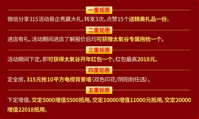 恰逢315,又千店喜賀太氧谷獲雙采標認證,怎得少了送大禮?點擊文章最后左下角“閱讀原文”,微信分享315活動易企秀,不僅可以了解最全面的活動詳情,同時,只要轉發3次,點贊15個,就可以贏得精美大禮一份,活動期間進店還獲贈太氧谷定制抱枕一個!數量有限,先到先得!