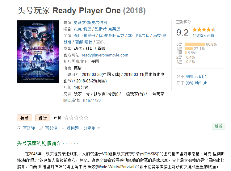今年到目前為止口碑最炸裂的電影莫過于世界級大導(dǎo)演史蒂文·斯皮爾伯格的《頭號玩家》,72歲的老頭王者歸來,用天馬行空的想象證明自己依舊是那個(gè)最厲害的“造夢大師”!影史經(jīng)典、Cult神作、街機(jī)游戲、懷舊美劇、二次元文化在《頭號玩家》里一網(wǎng)打盡,讓人從頭high到尾,每一秒的彩蛋,都讓游戲迷熱血沸騰,豆瓣更是直接給出了今年大熱片的最高分9.2。