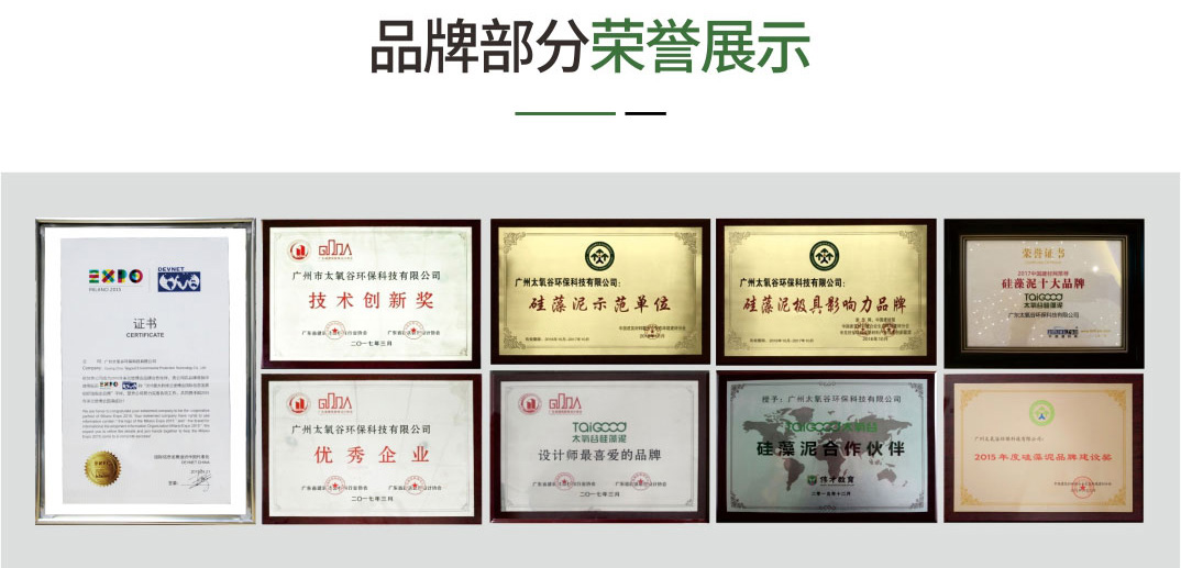 太氧谷憑借完美的硅藻泥品質以及品牌整體實力,從行業眾多品牌中脫穎而出,成為米蘭世博會及國際信息發展組織指定硅藻泥品牌,生產的產品先后通過國家建筑材料測試中心檢測認證、新華網防輻射合格檢測、ISO9001:2015國際質量體系認證。并與香港偉才國際教育集團簽約合作,免費為其30余所幼兒園音體室造綠色搖籃,開啟幼兒園綠色環保凈化工程。2016年榮獲中國硅藻泥網“十大科技創新成果”獎 ,2017年榮獲廣東建筑裝飾材料行業協會“優秀企業”、“技術創新獎”及“設計師最喜愛的品牌”獎, 中央廣播電臺“2017年度營銷創新獎”,新華家居中國家居行業“環保標桿品牌”。2016,2017連續兩年榮獲中國建筑材料聯合會生態環境建材分會“硅藻泥示范單位”、“硅藻泥極具影響力品牌”、“硅藻泥品牌建設獎”。