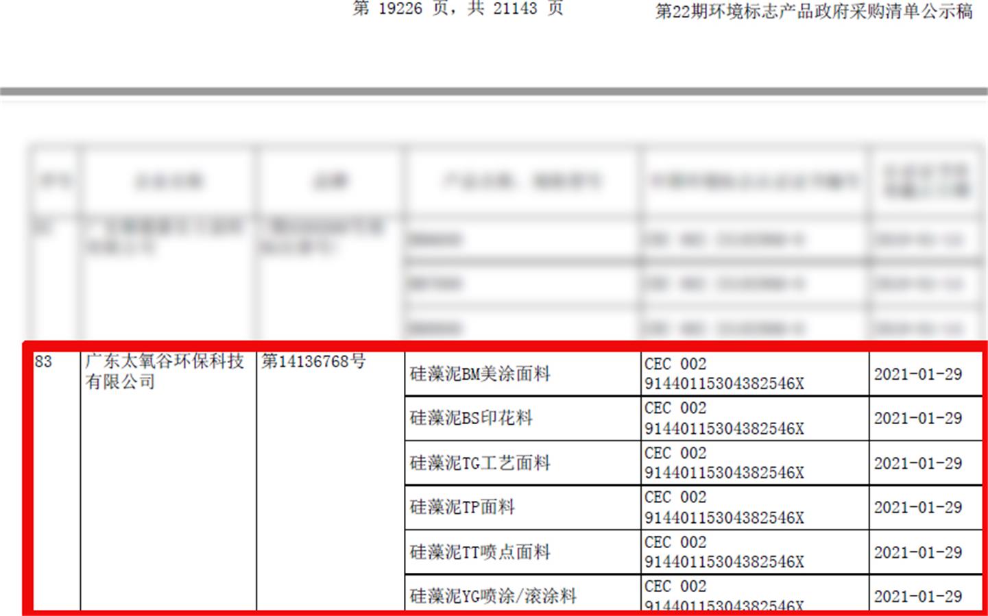 太氧谷硅藻泥肌理系列+白炭黑絲網印花+優谷滾涂三大系列產品成功列入國家第二十二期“環境標志產品政府采購清單”。