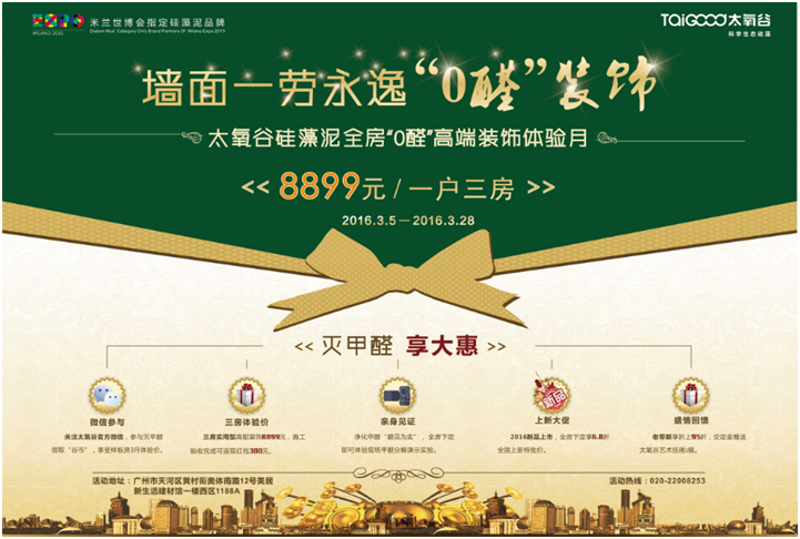 不忘初心,繼續征途。太氧谷硅藻泥三年雄謀大略迎來了最為關鍵也最為重要的2016年。一場轟轟烈烈的“全民打甲醛”活動正式拉開了太氧谷2016年全面突破升級的大幕!旨在讓更多的人意識到甲醛的嚴重危害性,號召全民參與到消滅甲醛的行列中;太氧谷還在全國首推“全房’0醛‘高端裝飾體驗月,在保證中高端產品及服務品質的同時,向市場推出一系列的“普惠”行動,讓高端的硅藻泥生態品質進入更多的家庭,讓更多的人群在健康、鮮氧、潔凈的空間里享受呼吸。