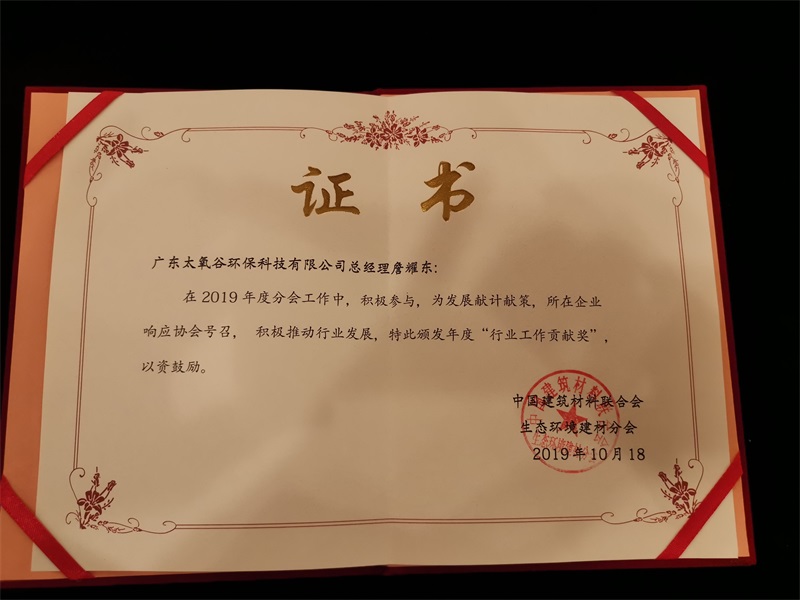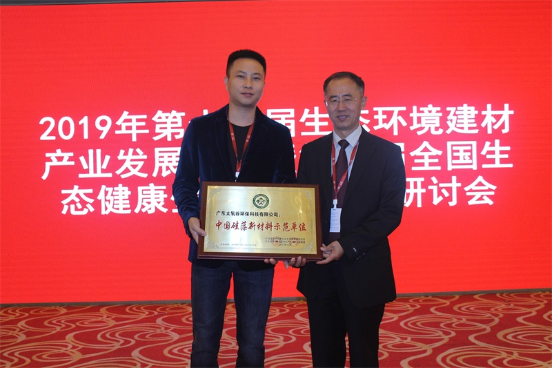 金秋十月,碩果累累。大會上對2019年度生態環境建材產業先進單位和個人進行了隆重表彰,太氧谷憑借科學除醛功能性硅藻泥產品的領先研發能力和卓越性能,在眾多企業單位中脫穎而出,實力榮獲“中國硅藻新材料示范單位”、“生態環境建材應用示范單位”、“生態環境建材示范單位”以及個人“行業工作貢獻獎”。