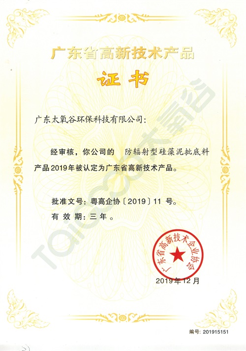 太氧谷作為高新技術環保企業,一直堅持科技與環保相結合的發展之路,致力于開發科技、環保、健康、生態及安全的產品,生產的產品先后通過國家建筑材料測試中心檢測認證、新華網防輻射合格檢測、ISO9001:2008國際質量體系認證、國家質量認證中心中國環保產品認證、國際“雙采標”認證、中國環境標志產品認證等 。于2019年12月,太氧谷硅藻泥被認定為“廣東省高新技術產品”!