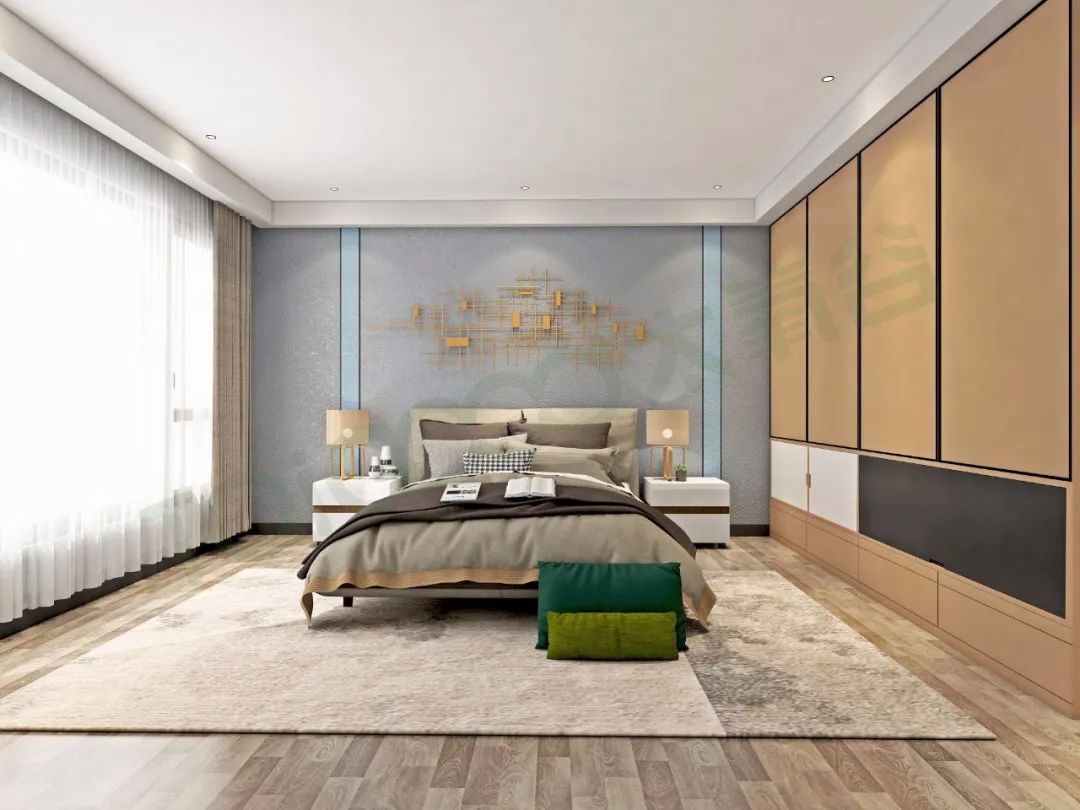 兒子房的床頭背景墻以沉穩高級的灰色為基調,中間選用金屬質感的設計裝飾,對稱的簡約床頭柜布置,床品與地毯、地板大致為同色系搭配,呈現出一個低調舒適而又不失雅致奢華的視覺感。