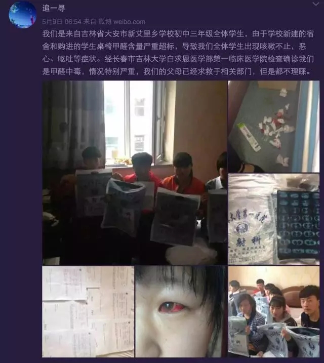 5月9日上午,有網友發微博稱,來自吉林省大安市新艾里鄉學校初中三年級學生,由于學校新建的宿舍和購進的學生桌椅甲醛含量嚴重超標,導致學生出現咳嗽不止,惡心、嘔吐等癥狀。該網友在微博中表示,經長春市吉林大學白求恩醫學部第一臨床醫學院檢查確診學生是甲醛中毒。
