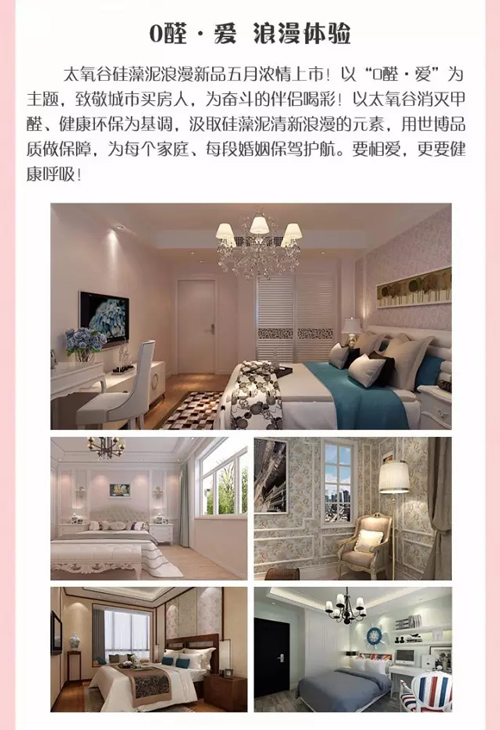 太氧谷硅藻泥強勢推出“要愛,更要健康呼吸”的“0醛”體驗活動,結合五月新品主題“0醛·愛”,為業主客戶提供硅藻泥高端裝飾套餐體驗,定制與眾不同的搭配設計方案。將白炭黑高端品質完美融入到定制方案之中,濃情推薦“摯愛臥房”的浪漫新品裝飾套餐,從此將硅藻泥簡單的墻面裝飾進階到更高級的私人定制藝術個性化搭配,與您居室的軟裝完美融為一體。兼具硅藻泥的健康環保性、個性化藝術性,真正打造升級成為符合現代人審美品位需求的墻面生態藝術美學,讓更多人真正享受科學、生態與藝術相結合的綠色美學盛宴。