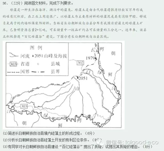 (2)分析長白朝鮮族自治縣硅藻土開發(fā)的有利區(qū)位條件。(8分)