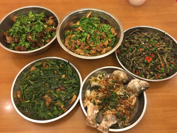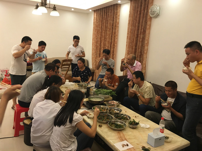 當然,也有一群人,開始操持忙碌大伙的晚餐,自己動手豐衣足食,有去市場買菜配料的,也有洗刷鍋碗瓢盆做準備工作的,當然一頓豐盛晚餐的出品需要團隊共同協作,才能奏起和諧的交響曲。由太氧谷品牌總監詹總負責總指揮,由空間設計部李經理負責掌勺,由人事部總務鄧總管負責采購協調,還有一眾青春活波的少女團負責后勤協助……從清鍋碗、洗菜、切菜、配菜到炒菜一條龍流水作業,大廚們拿手硬菜輪番出爐,色香味俱佳!領導親自掌廚,還有比我們更幸福的員工嗎?到最后開吃的時候,大伙兒連酒都顧不上喝,一個個吃貨本質盡顯,戰斗力爆表,幾乎把所有的菜都掃蕩而空,大有風卷殘云之勢!