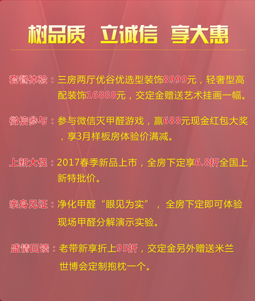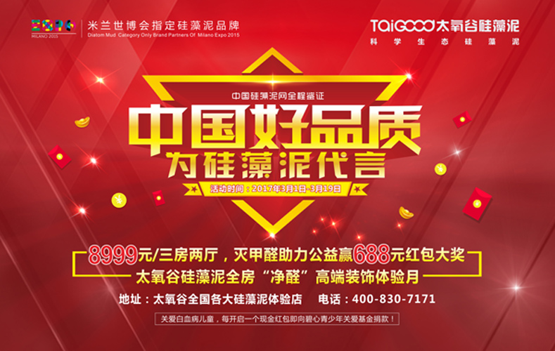 這不,太氧谷硅藻泥“中國好品質、為硅藻泥代言”的全房“凈醛”高端裝飾體驗活動即將在3月1日霸氣開啟!實實在在的鉅惠套餐,真金白銀的多重減現優惠,不用套路只想用真心撩到您!