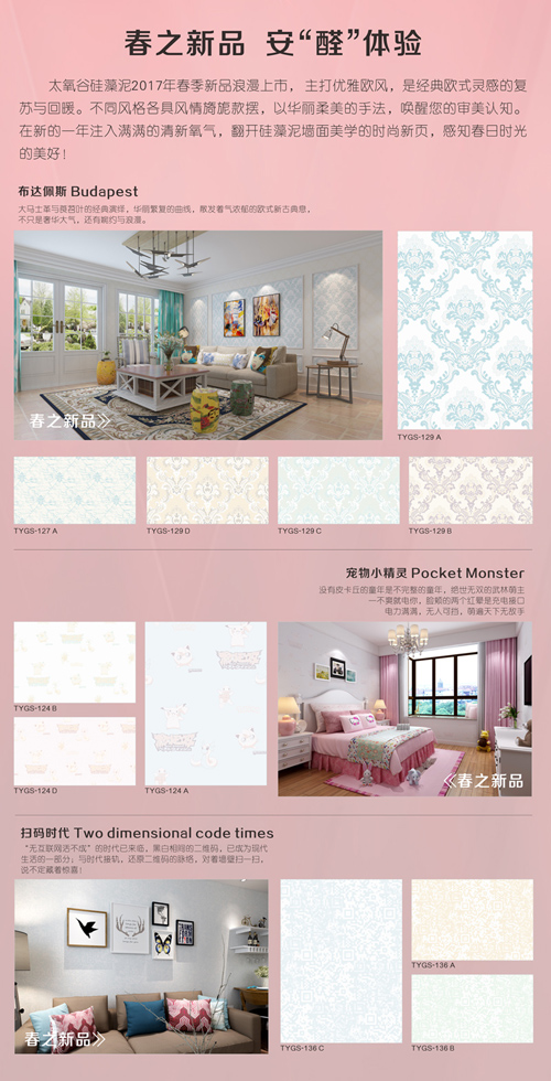 太氧谷硅藻泥2017年春季新品浪漫上市,此次在全房套餐內贈送價值不低于2000元的新品背景,為您在新的一年注入滿滿的清新氧氣,翻開硅藻泥墻面美學的時尚新頁,感知春日時光的美好!
