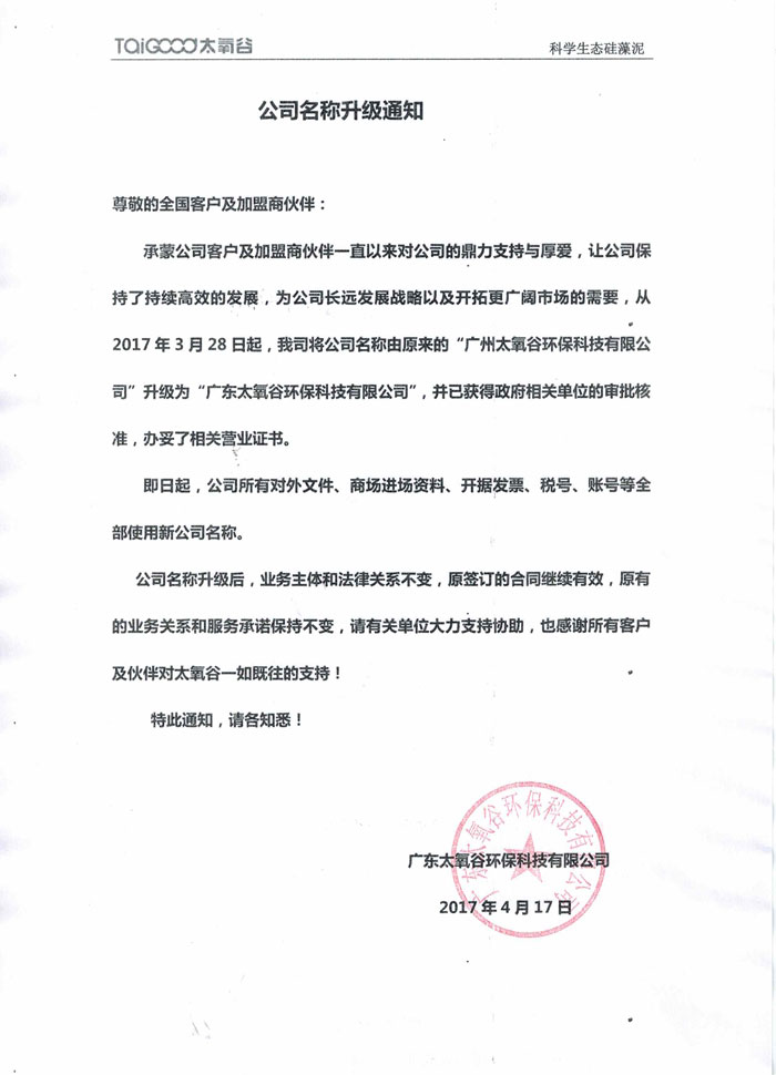 承蒙公司客戶及加盟商伙伴一直以來對公司的鼎力支持與厚愛,讓公司保持了持續高效的發展,為公司長遠發展戰略以及開拓更廣闊市場的需要,從2017年3月28日起,我司將公司名稱由原來的“廣州太氧谷環保科技有限公司”升級為“廣東太氧谷環保科技有限公司”,并已獲得政府相關單位的審批核準,辦妥了相關營業證書。