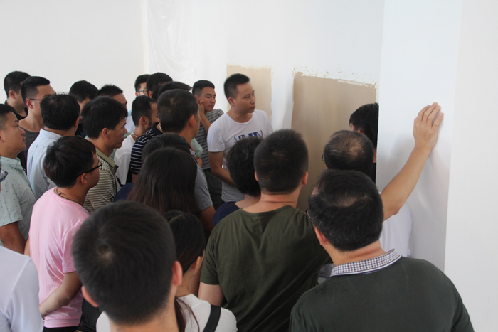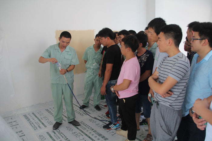 在當今社會分工越來越明細、專業化要求越來越高的時代,對企業精細化管理要求的重要性尤為凸顯。在張總激情的開場白之后,施工部經理許潤才先生圍繞施工管理、匠工品質兩大塊開展了長達兩個小時的講解與培訓。許經理強調任何高品質硅藻泥產品完成的背后都需要一個良好的施工習慣和標準化的施工規范去支撐。一個專業技師的優秀不是與生俱來的,但一個優秀的技師一定是從樹立施工高品質意識、從良好的工作習慣中培養而來的。一個剛入門技師也許初期技藝不夠精湛,但是必須要態度先行,嚴格要求自身,從整理工具的小事做起,干凈良好的工具再加上規范化的施工是一個初級技師必須反復加強練習的基本功!